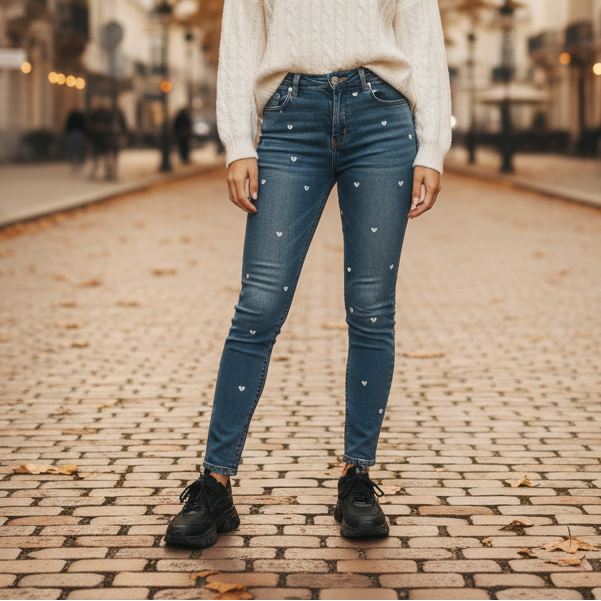 Composez votre look casual chic parfait avec ce trio féminin et tendance. Un sweat douillet aux détails cœur, un jean stretch élégant aux broderies cœur assorties, et la touche finale qui fait tout : les chaussettes strass incontournables de Da Cinzia.