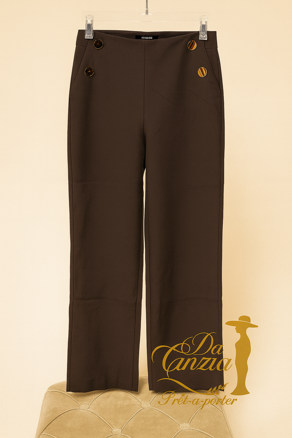 Pantalon marron chic avec boutons décoratifs – Coupe élégante –