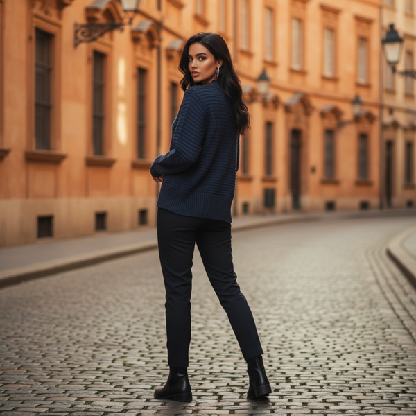 Adoptez un look chic et moderne avec cette superbe veste bleu marine coupe cascade. Une pièce élégante, facile à porter, qui structure instantanément la silhouette.