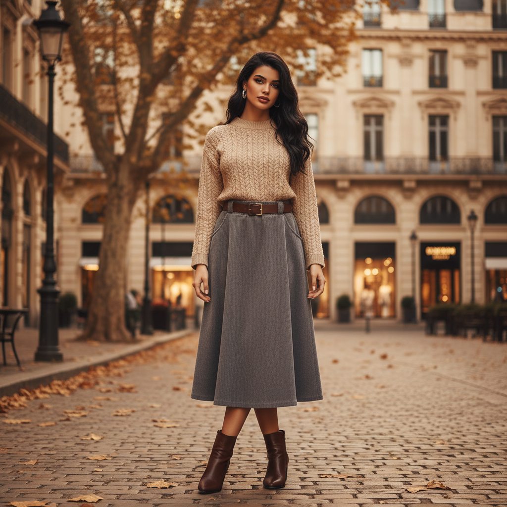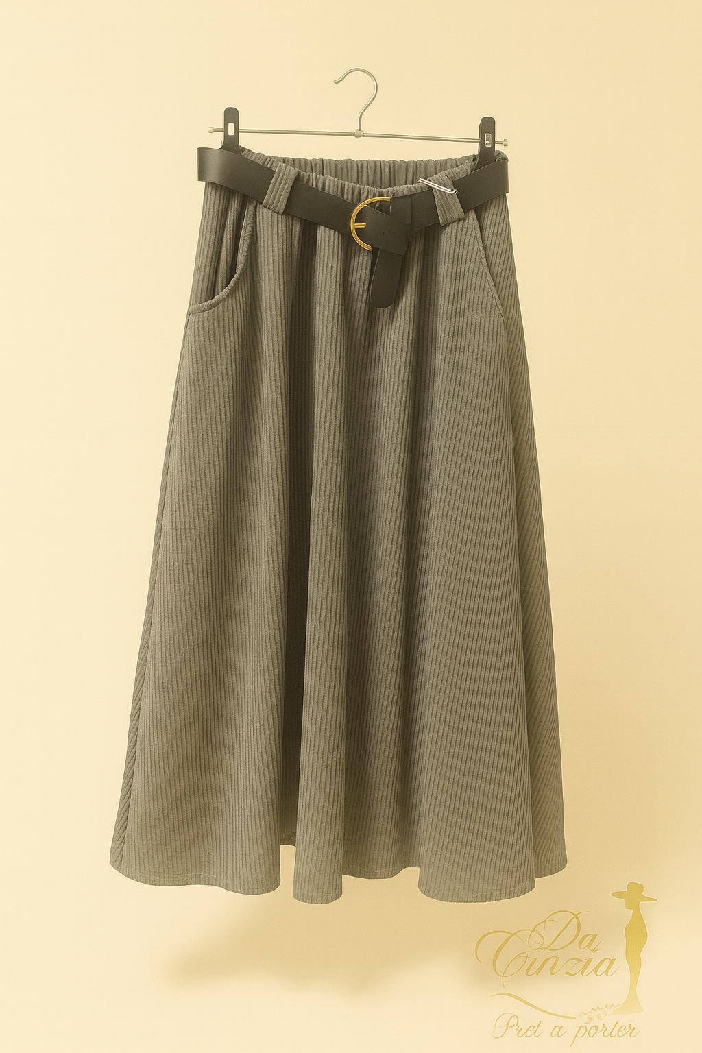 Jupe évasée taille haute avec ceinture – Chocolat / Bleu Marine / Gris